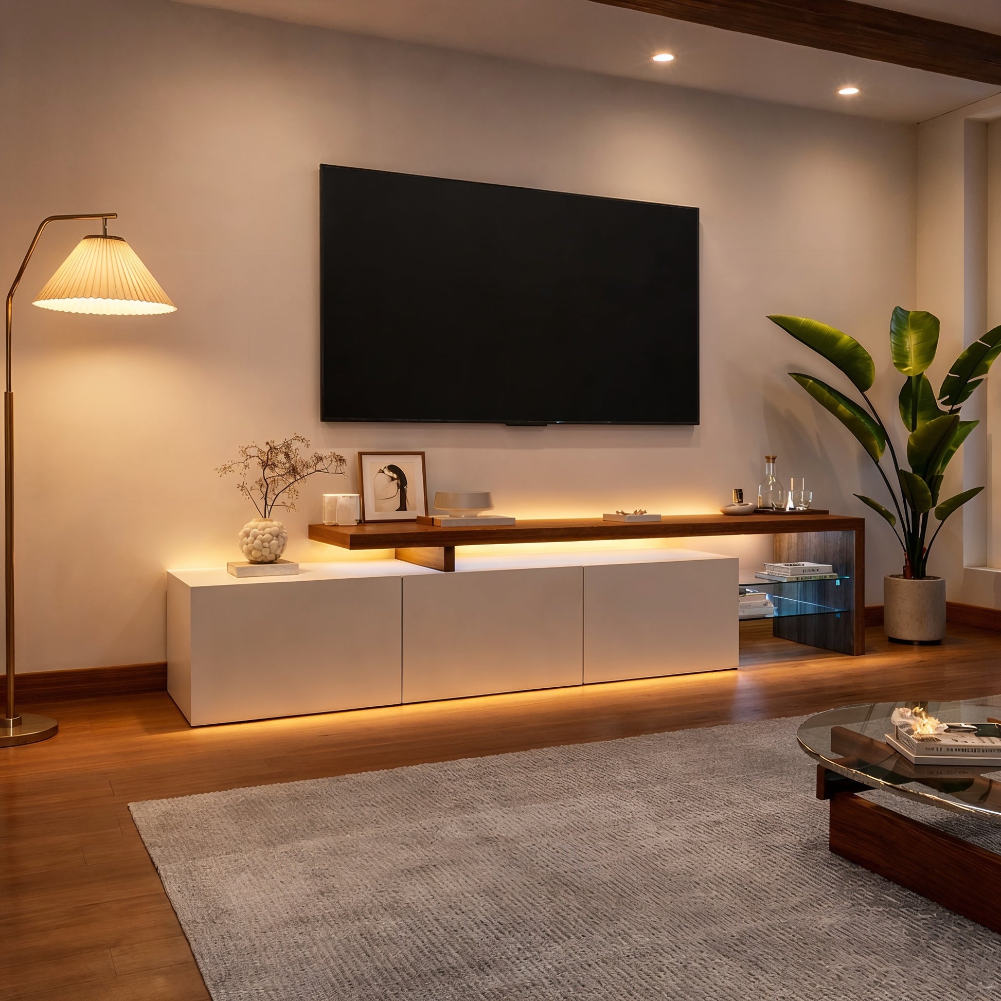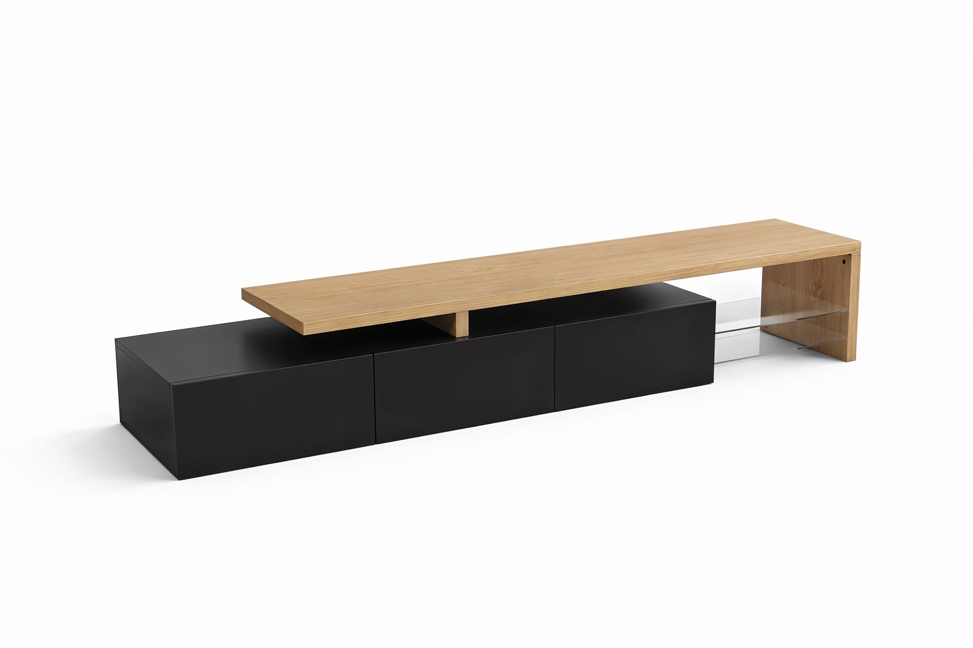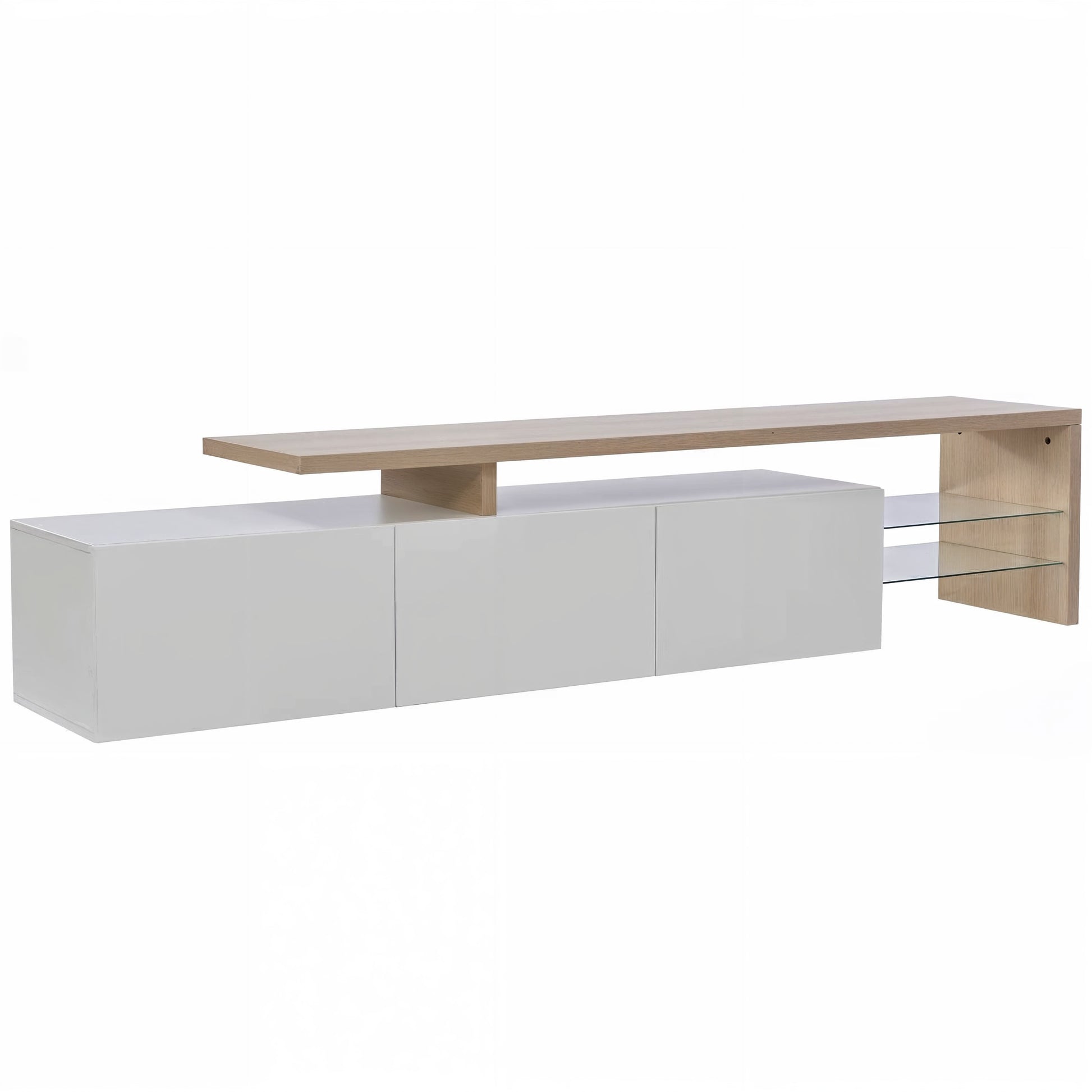 Une touche chaleureuse et moderne avec notre meuble TV de 180 cm. Conçu pour accueillir des télévisions jusqu'à 80 pouces, il allie élégance et fonctionnalité, avec des tiroirs en rotin et des portes en verre courbes qui protègent vos appareils tout en ajoutant du charme à votre pièce.