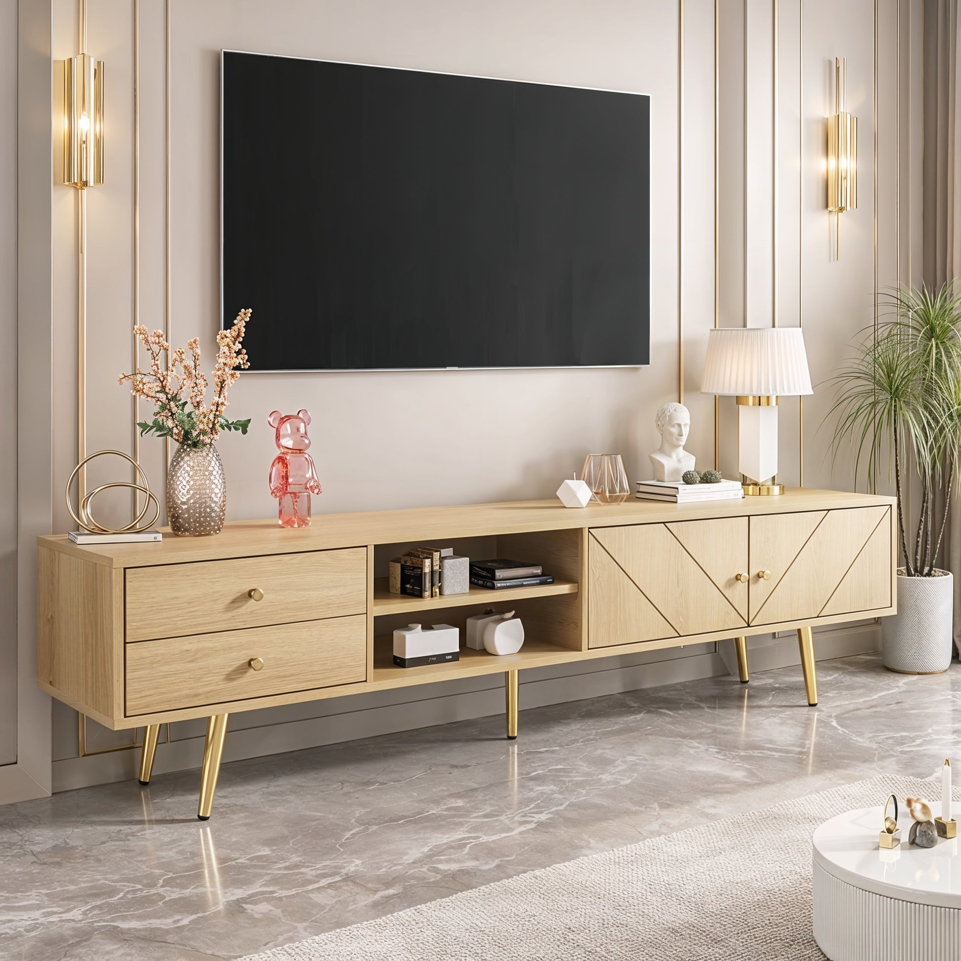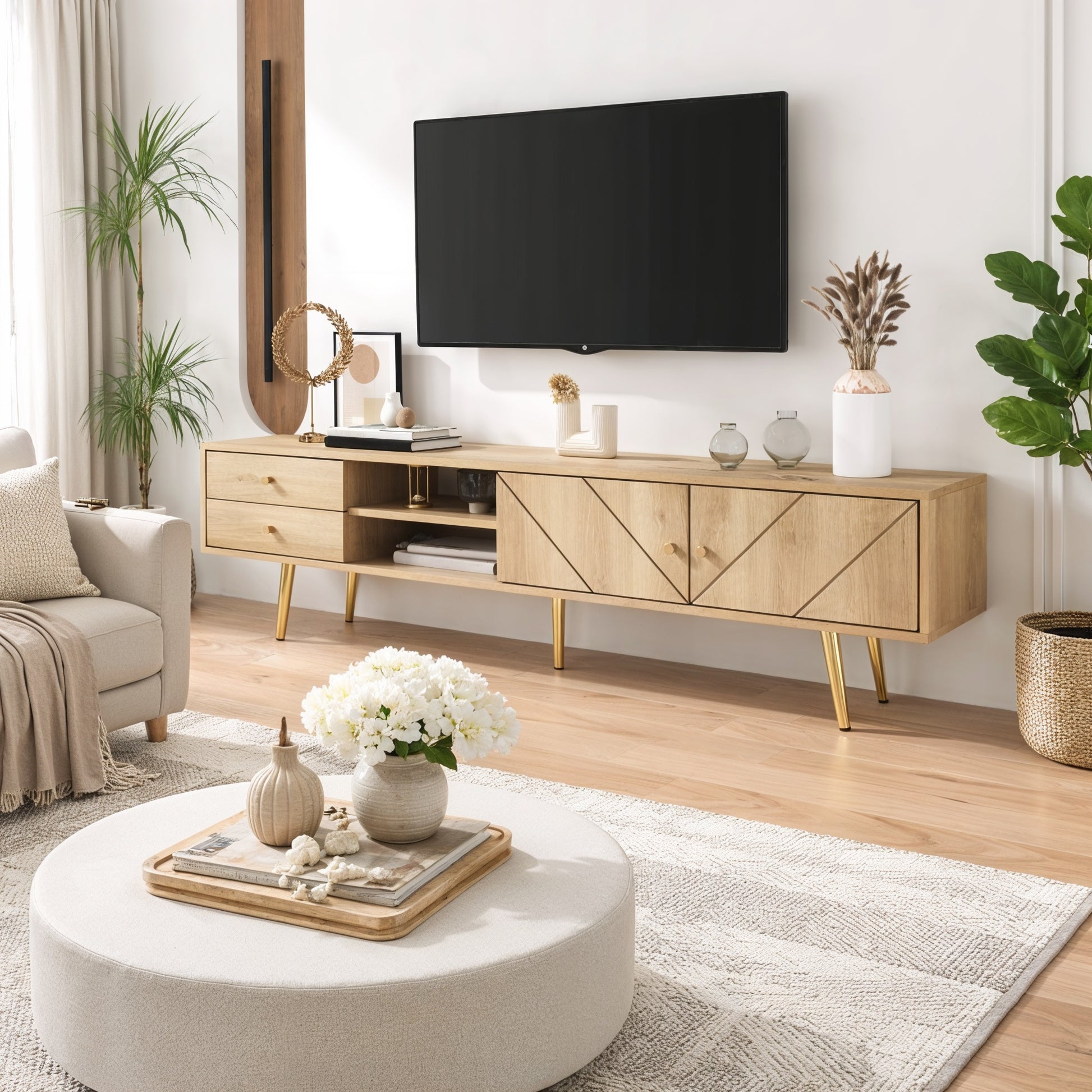 Une touche chaleureuse et moderne avec notre meuble TV de 180 cm. Conçu pour accueillir des télévisions jusqu'à 80 pouces, il allie élégance et fonctionnalité, avec des tiroirs en rotin et des portes en verre courbes qui protègent vos appareils tout en ajoutant du charme à votre pièce.