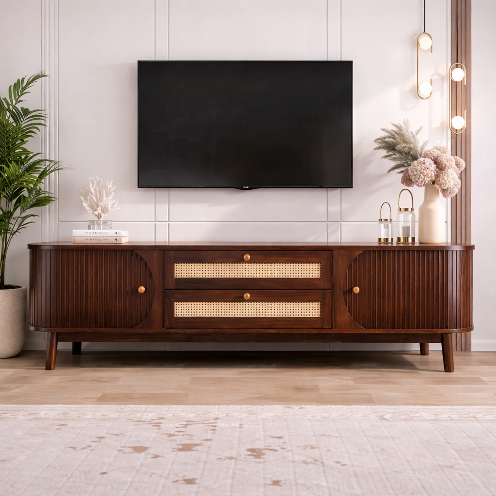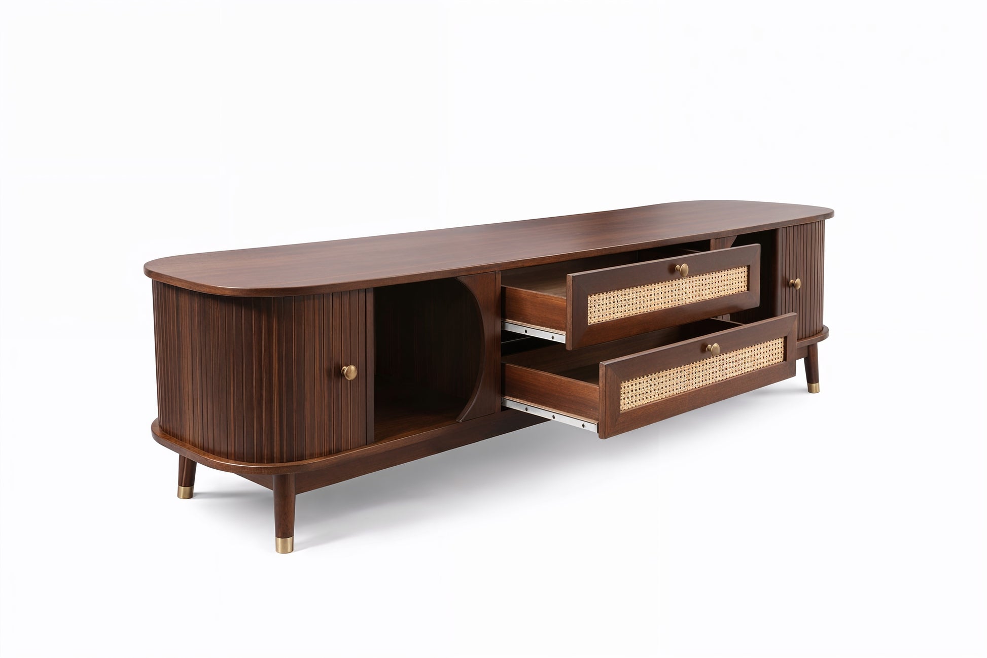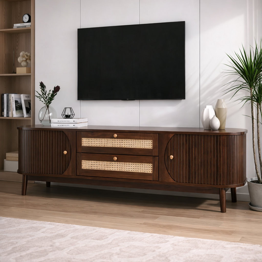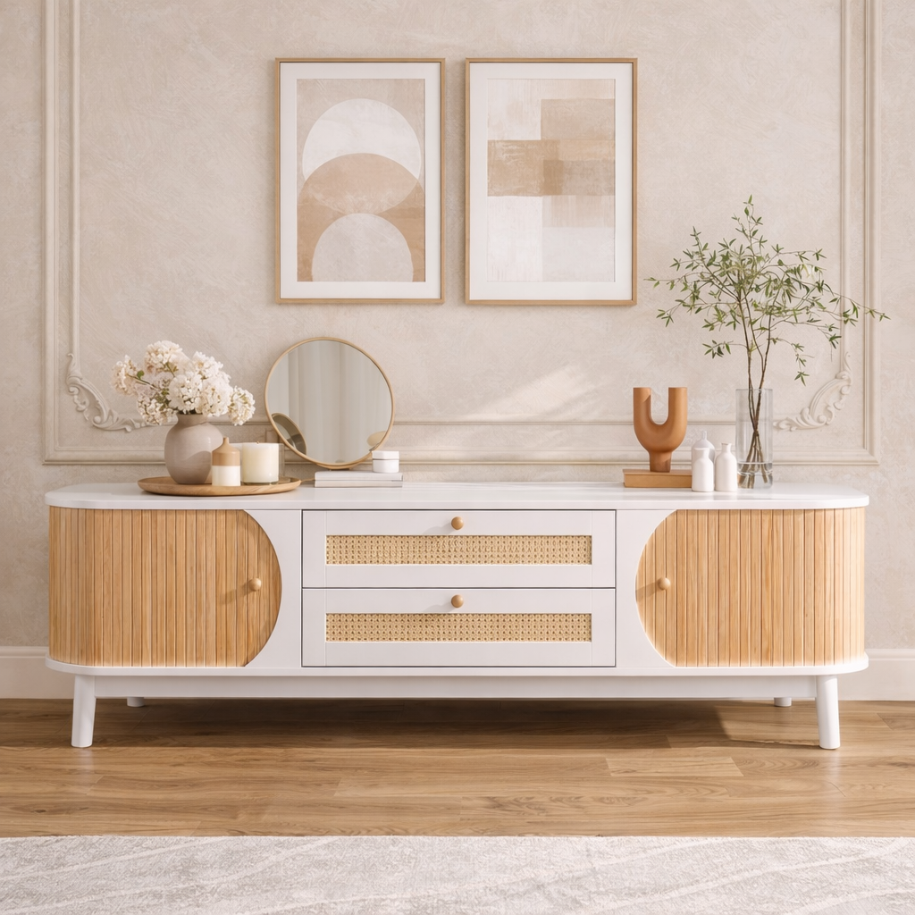 Une touche chaleureuse et moderne avec notre meuble TV de 180 cm. Conçu pour accueillir des télévisions jusqu'à 80 pouces, il allie élégance et fonctionnalité, avec des tiroirs en rotin et des portes en verre courbes qui protègent vos appareils tout en ajoutant du charme à votre pièce.